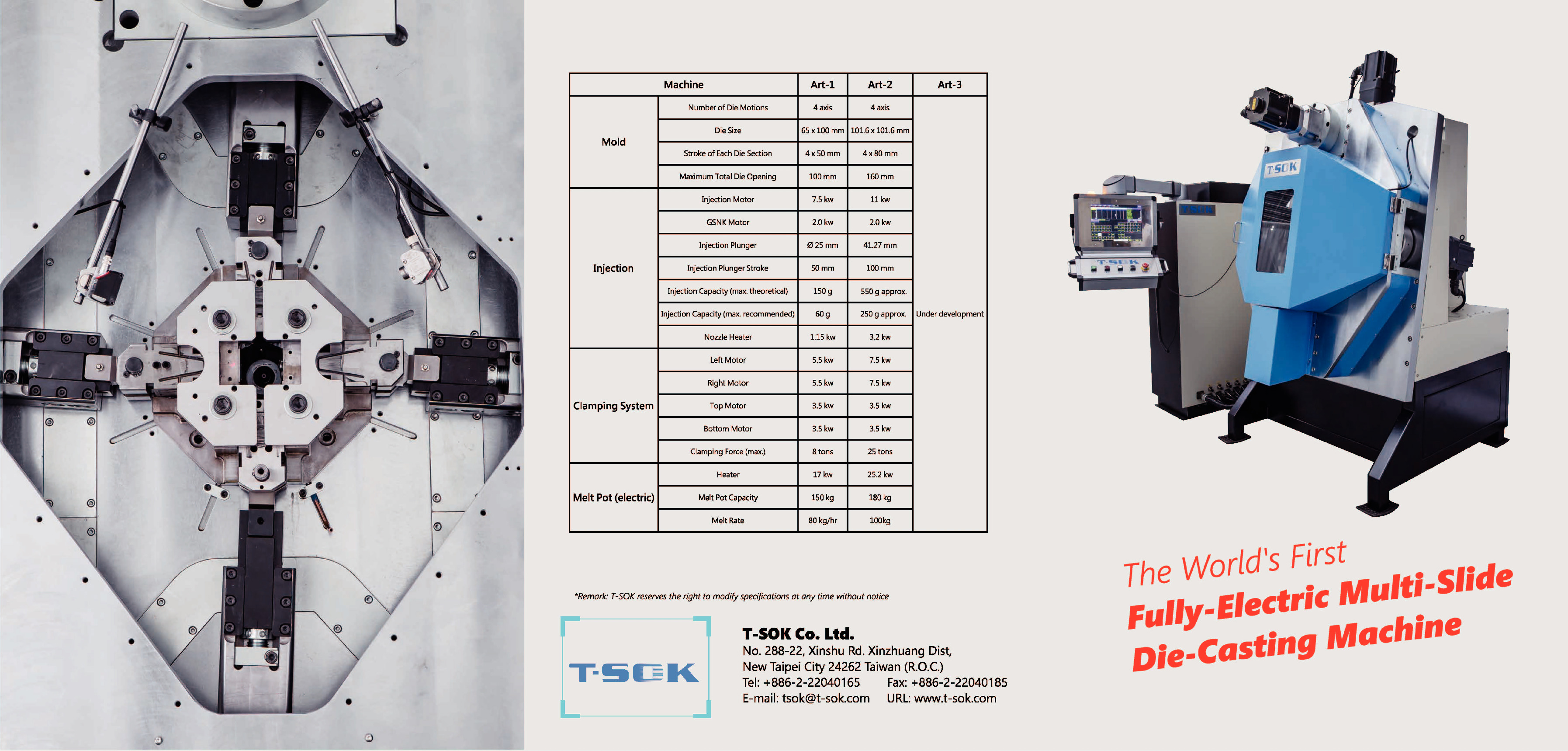 T-SOK Co. Ltd. is one of the leading global manufacturers of multi-slide hot chamber die casting machines for zinc and the relevant equipment. With its evolutionary Fully Electric multi-slide die casting machine, it has significantly increased the density and surface quality of the castings to a new standard. Apart from being the machine supplier, T-SOK has a tool shop well equipped with the most modern machineries, and experienced toolmakers with the know-how which can offer our customers a complete service: from the design and manufacturing to the testing and sampling; delivering high quality dies ready for production.Since the foundation of T-SOK, the business has continued to grow based upon our ability to source and supply die casting services of the highest standard, ranging from individual machines for small to medium size businesses to tailored solutions for larger organizations.