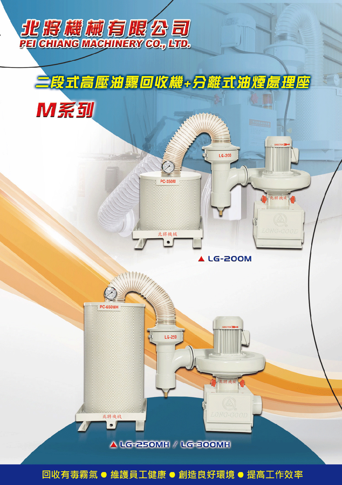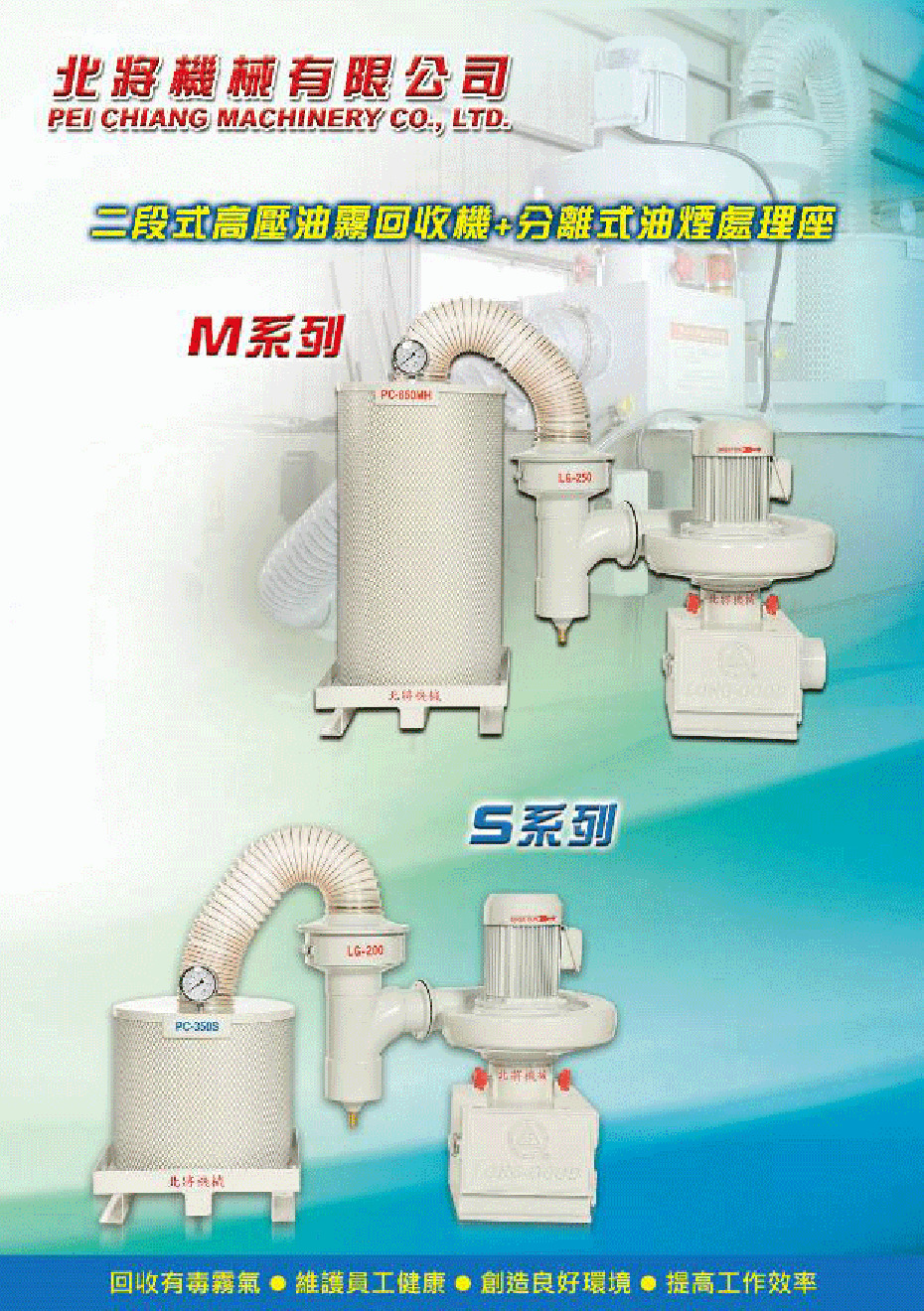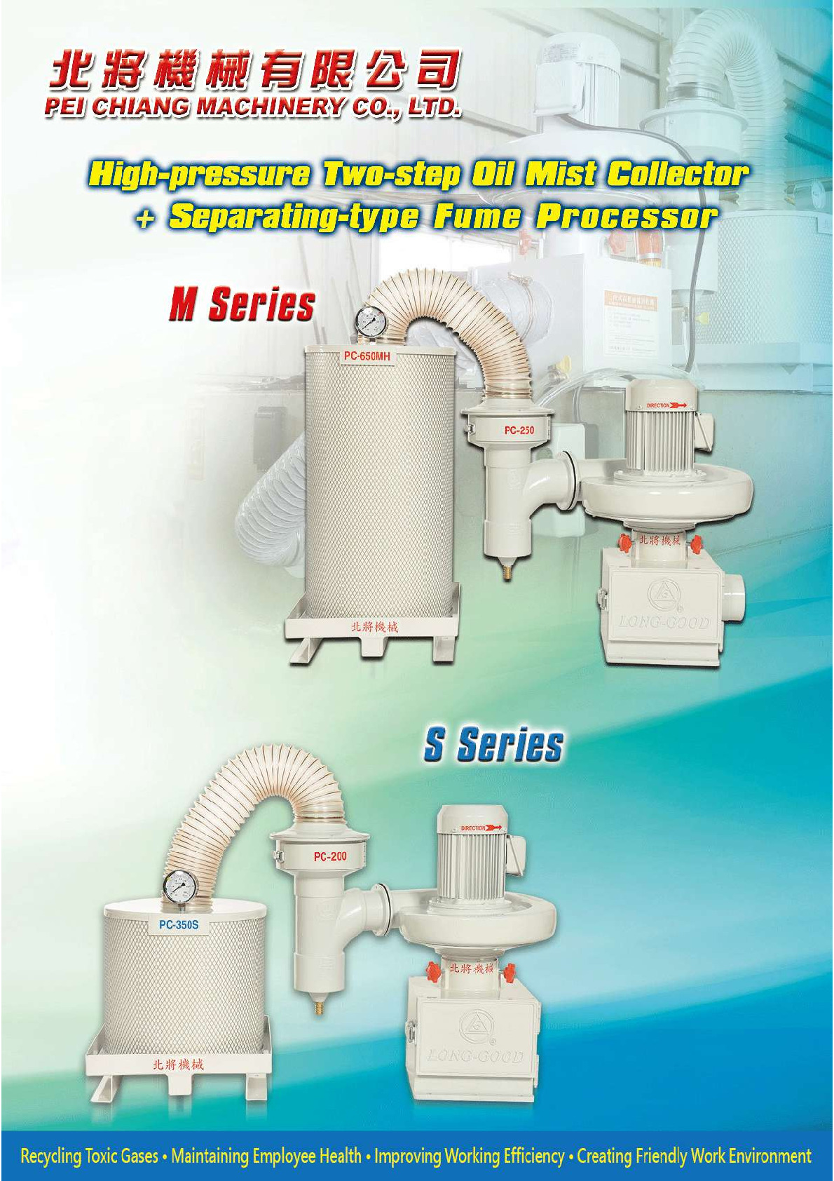 PEI CHIANG Machinery strives for excellence. In response to the current problems of PM 2.5, suspended particulates, white smoke, oil mist, etc., it actively launched "M Series and S Series set model, which is Two-step High-pressure Oil Mist Collect + Separated-type Fume Processor. The new model can effectively process PM 2.5, suspended particulates, white smoke, etc., and has won customer’s high admiration.