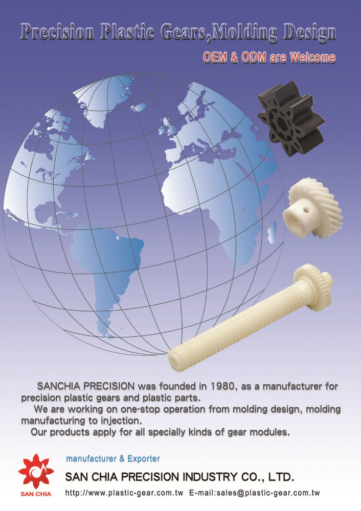 SAN CHIA PRECISION was founded in 1980, as a manufacturer for precision plastic gears and plastic parts.We are working on one-stop operation from molding design, molding manufacturing to injection.