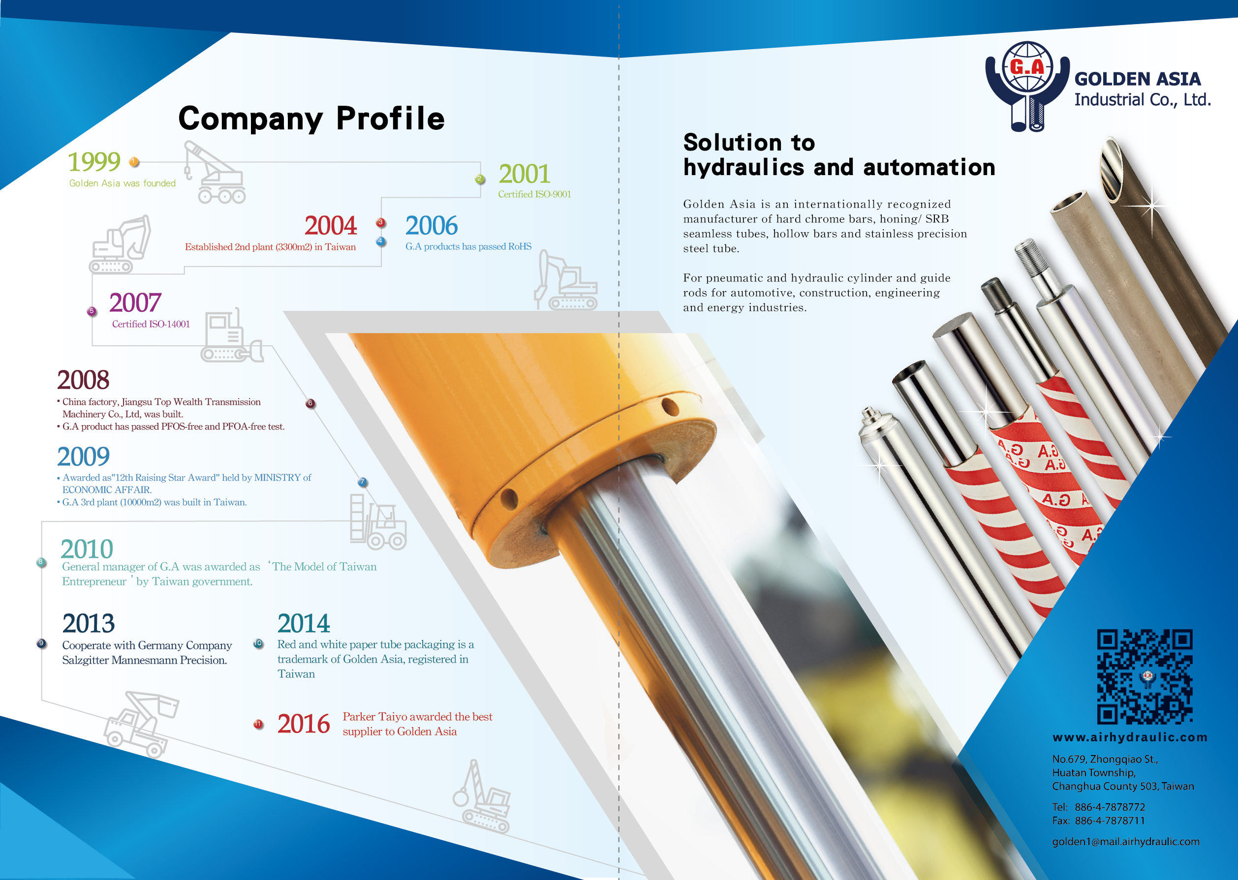 Golden Asia is a professional manufacturer of cylinder tube, hydraulic pipe tubing, seamless carbon steel, hydraulic tubing, seamless tube, cylinder chrome rod, hard chrome bar, hydraulic piston rod, hydraulic shaft, piston shaft, hard chrome plated steel bar, induction hardened chromed shaft and precision stainless tube/rod for heavy machinery, the industry of hydraulics, mining and agricultural machinery.