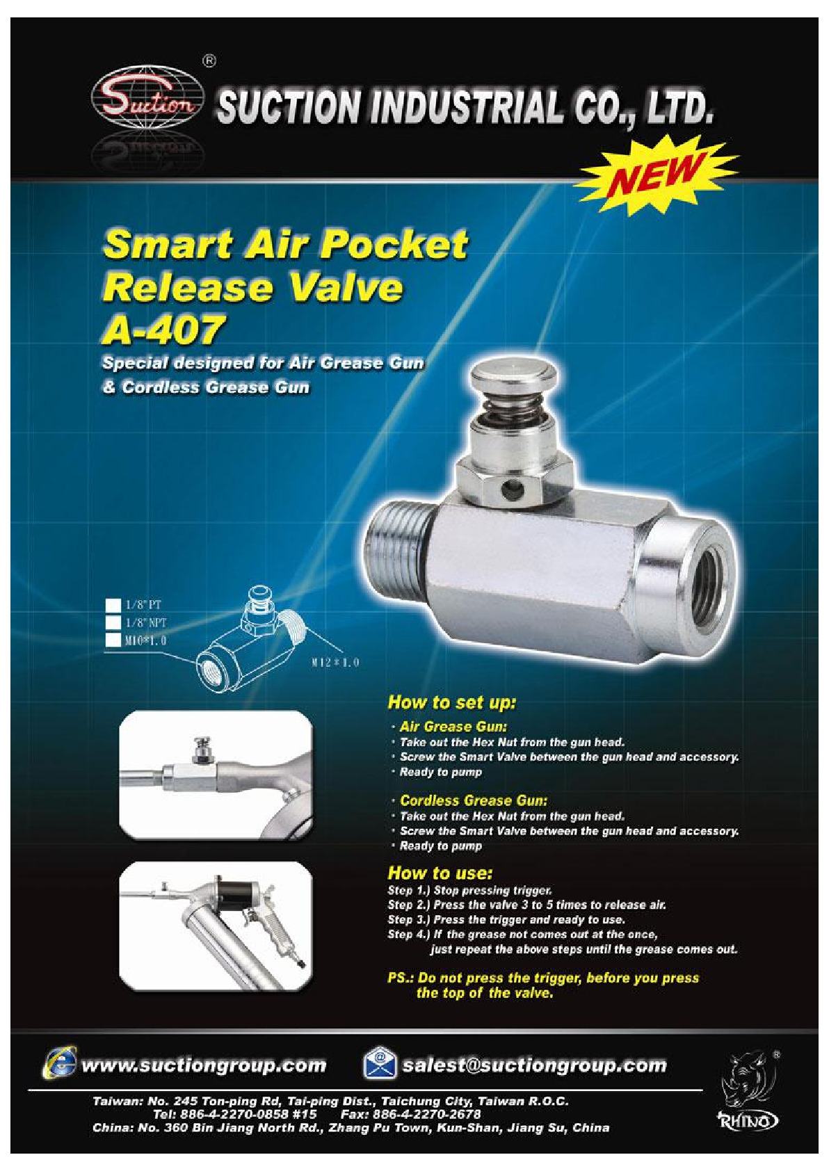 Suction is proud to present its high quality standard and value-added philosophy. The enterprise was certified by ISO 9001-2000 QMS in 2005; and it specializes in producing manual grease gun, cordless grease gun, air grease, oil suction guns, transfer pumps, oil bucket pumps, and accessories. With well-trained workers and modernized facility, the company is ready to take off and face the challenges in the next stage.