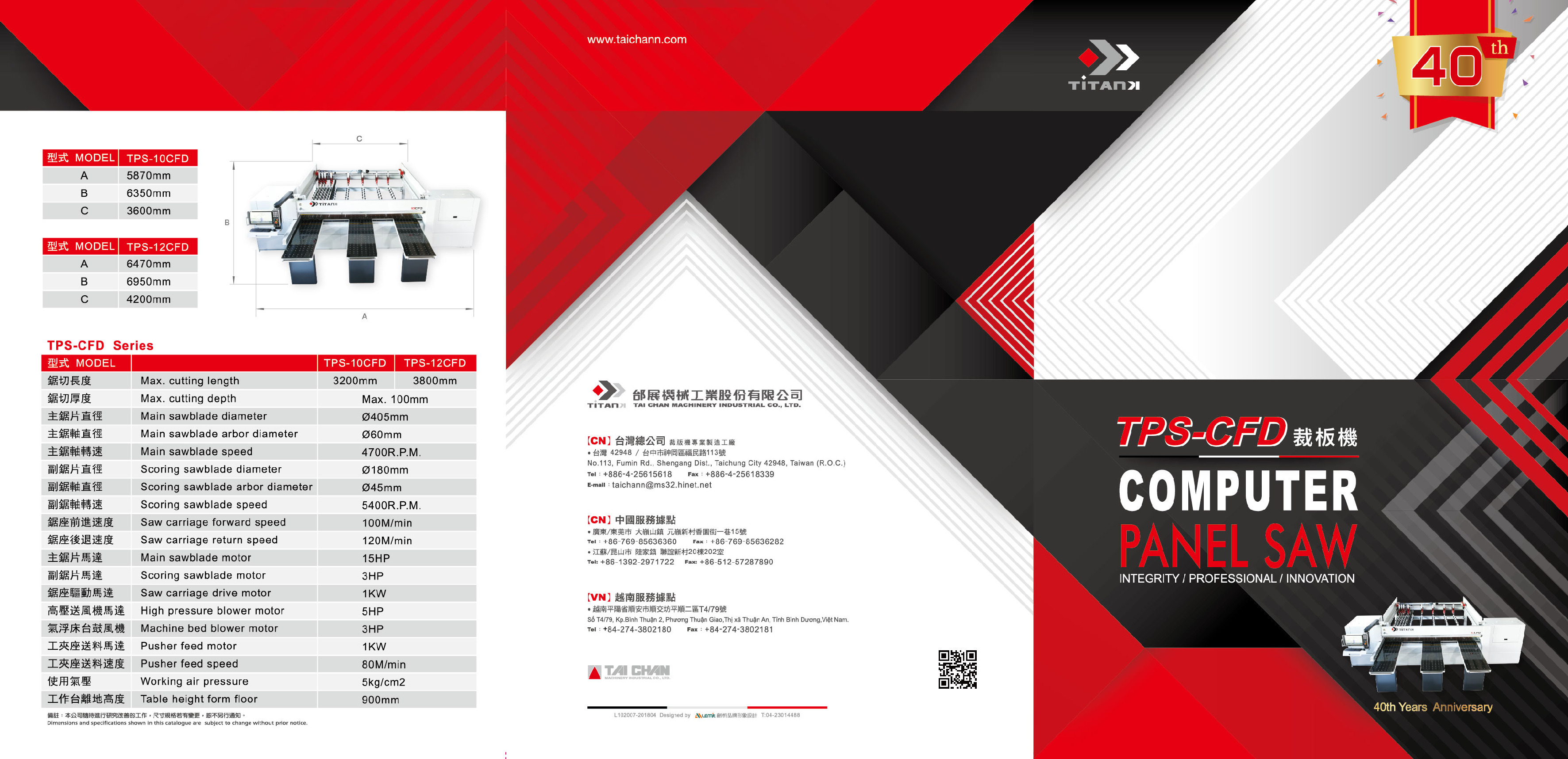 TAI CHAN MACHINERY INDUSTRIAL CO., Ltd. established in 1978, specializes in manufacturing various kinds of machinery for the woodworking industry. When we first started, TAI CHAN’s main focus was on traditional woodworking machines, then we moved on to developing NC & PLC controlled panel saw machines.