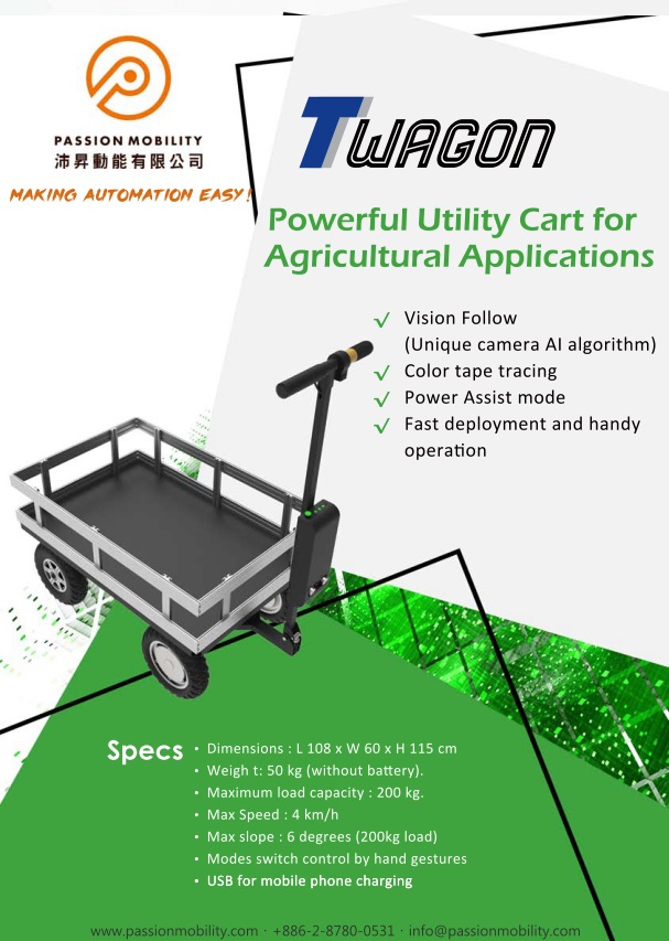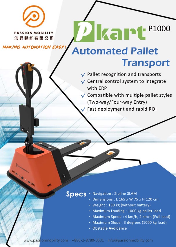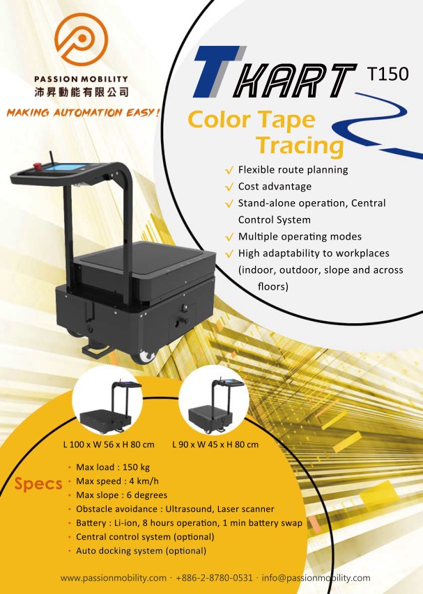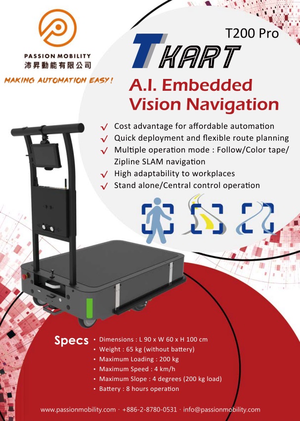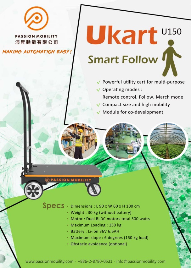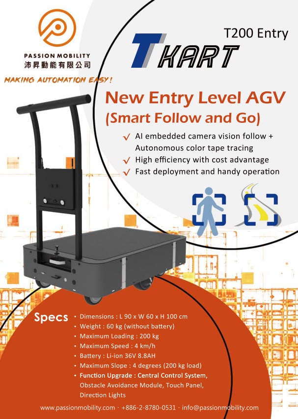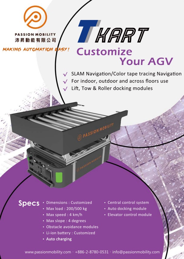 Passion Mobility develops autonomous technologies and designs electric-powered products to meet the needs of automation and material handling. We launched CaddyTrek, a robotic golf caddy in 2011. Our innovative technologies were extended to cost-effective solutions of implementing factory, warehousing and logistics automation and we also developed Tkart (AGV) and Ukart with A.I. Embedded Vision Navigation. We'll keep working on new products and providing advanced solutions to customers.
