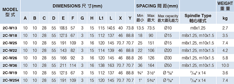- Adjustable spacing between spindle: 13.5 - 164 mm.