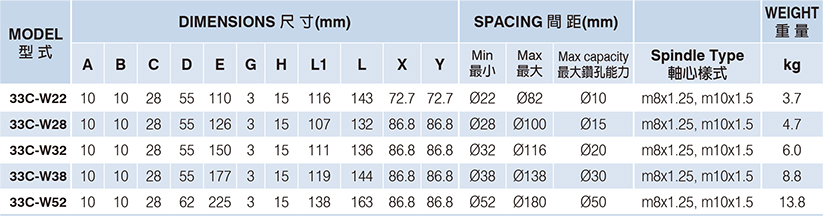 - Adjustable distance between spindles: ø22 - ø180 mm.