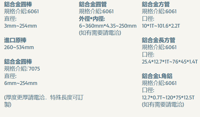 Aluminum alloys: square bars, square tubes, flat bars, flat tubes, round bars, round tubes (6061, 6063, 6463, 7075)