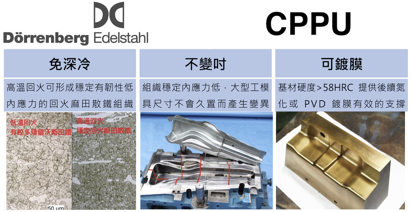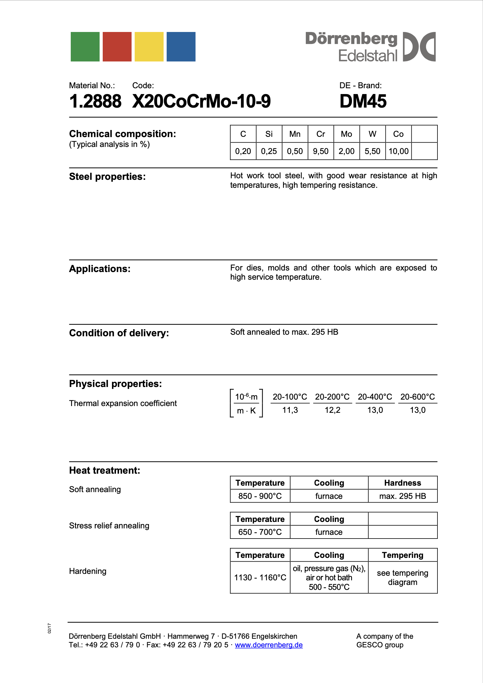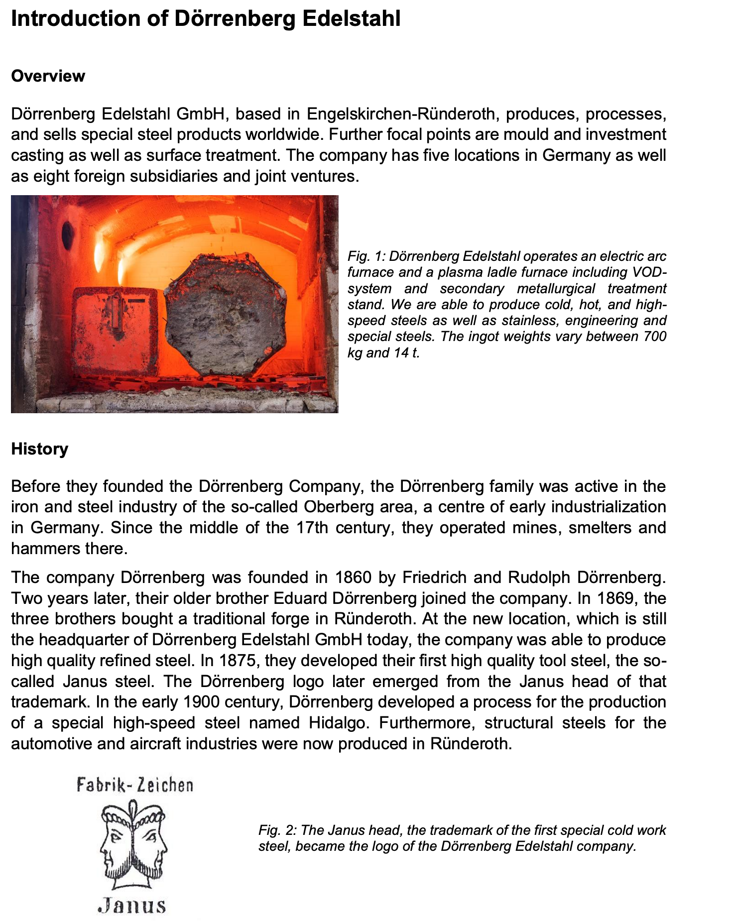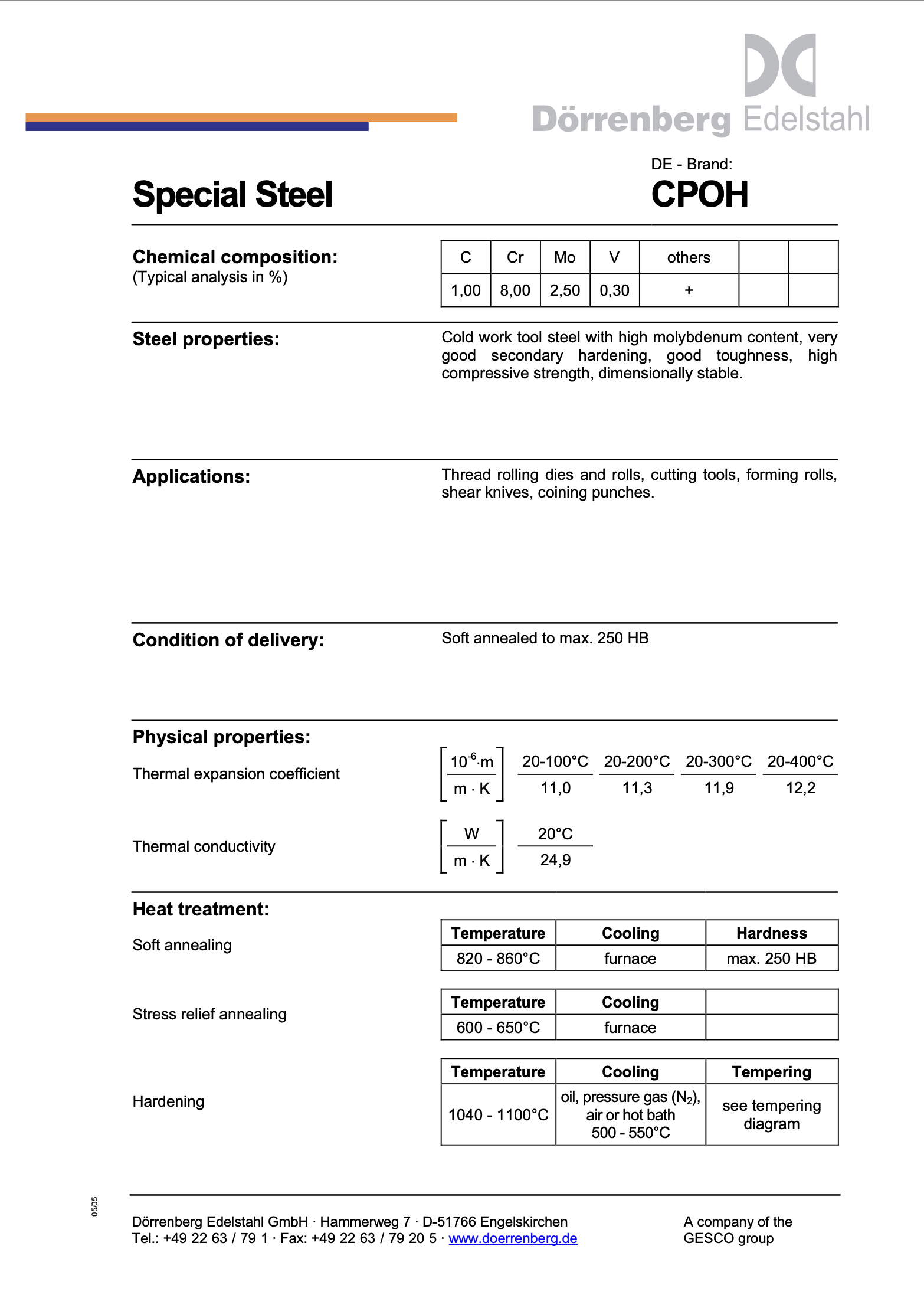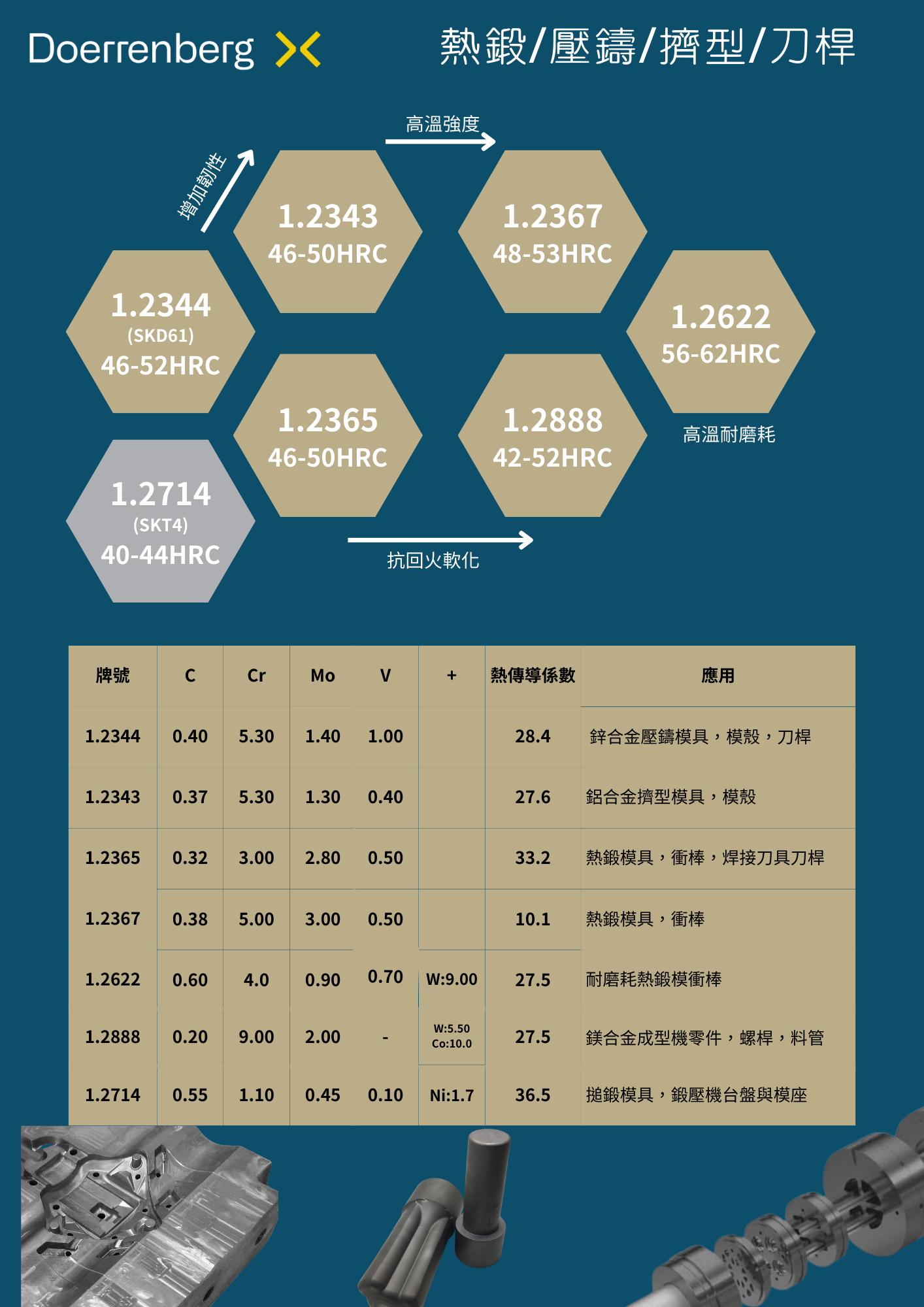 道博特殊鋼為歐洲的大型工模具鋼供應商,百年來專注於工具鋼的生產與應用,特殊鋼部門提供庫存,基本加工,熱處理,表面處理與3D鋼材列印服務。道博特殊鋼的宗旨ANY STEEL ANY TIME,是以客戶的需求為出發點,結合超過百年的煉鋼技術與眾多客戶的使用經驗,提升客戶製作工模具的競爭力,來因應現在市場嚴苛的品質與成本要求。道博台灣分公司與原廠技術人員密切配合,提供台灣客戶即時的庫存與技術服務。主要客戶的行業為冷鍛模具與設備,熱鍛,壓鑄,汽車模具,切削刀具。