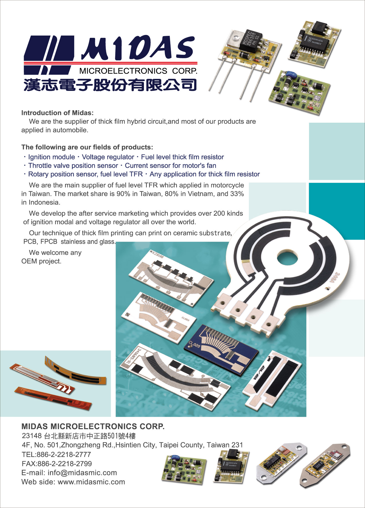 由2002年起轉為以汽車產業為大宗,是公司主要的營收來源. 本公司生產厚膜電路在汽車電子上的應用包括點火 器模組,電壓調整器模組及車用油錶等。