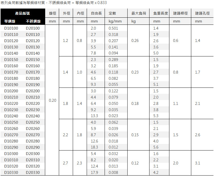 SPEC 壓縮彈簧優質的材料特性和專業的生產技術,提升了彈簧的使用壽命,為設計工程師、生產者和維修人員節省計算及更換作業的時間與成本。 材質 琴鋼線 DIN17223 不銹鋼線 DIN17224 線圈 右旋 兩端 線徑 0.8mm(含)以下,直角、無磨平 線徑 1.0mm(含)以上,直角、磨平 表面 防銹油處理 公差 依據 DIN2095
