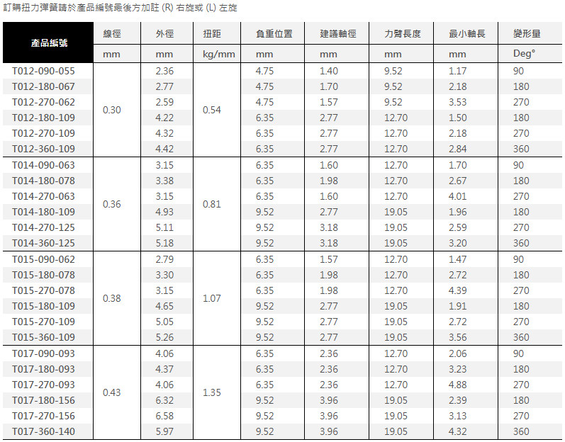 SPEC 的扭力彈簧可以儲存和釋放扭轉過程中的能量,在短距離內獲得足夠的彈力,扭力彈簧工作時應向彈簧盤繞方向扭轉,如果朝反方向扭轉無法達到最大負重值,在良好的安裝狀態下,使用低於表中20%的扭力值,可延長彈簧的使用壽命。 材質 SUS302 不銹鋼線 線圈 左旋、右旋 末端 標準品末端為直線 表面 塗膜處理 公差 外徑 ± 5%