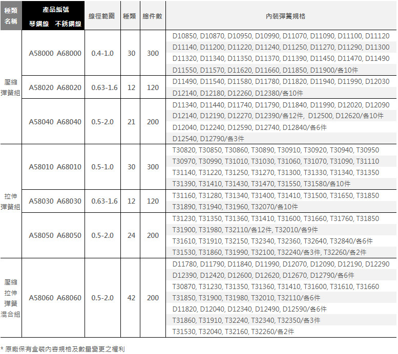 工程師、設計師以及維修人員都認為SPEC盒裝彈簧組提供了他們在工作上的便利性,特別適合於實驗性、開發性、初期性和維修性各階段的需求,盒內彈簧分類編號,方便識別及補充。 盒裝尺寸 (LxWxH) 31x21.5x7cm 盒裝材質 金屬