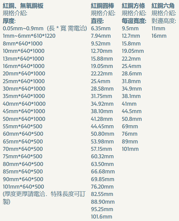 紅銅:C1020(無氧銅):板;C1100(紅銅):板、銅箔、方條、扁條、圓棒、卷管