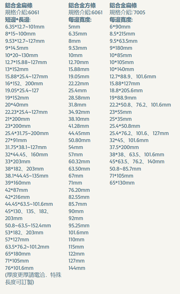 鋁合金:方條、方管、扁條、扁管、圓棒、圓管(6061、6063、6463、7075)