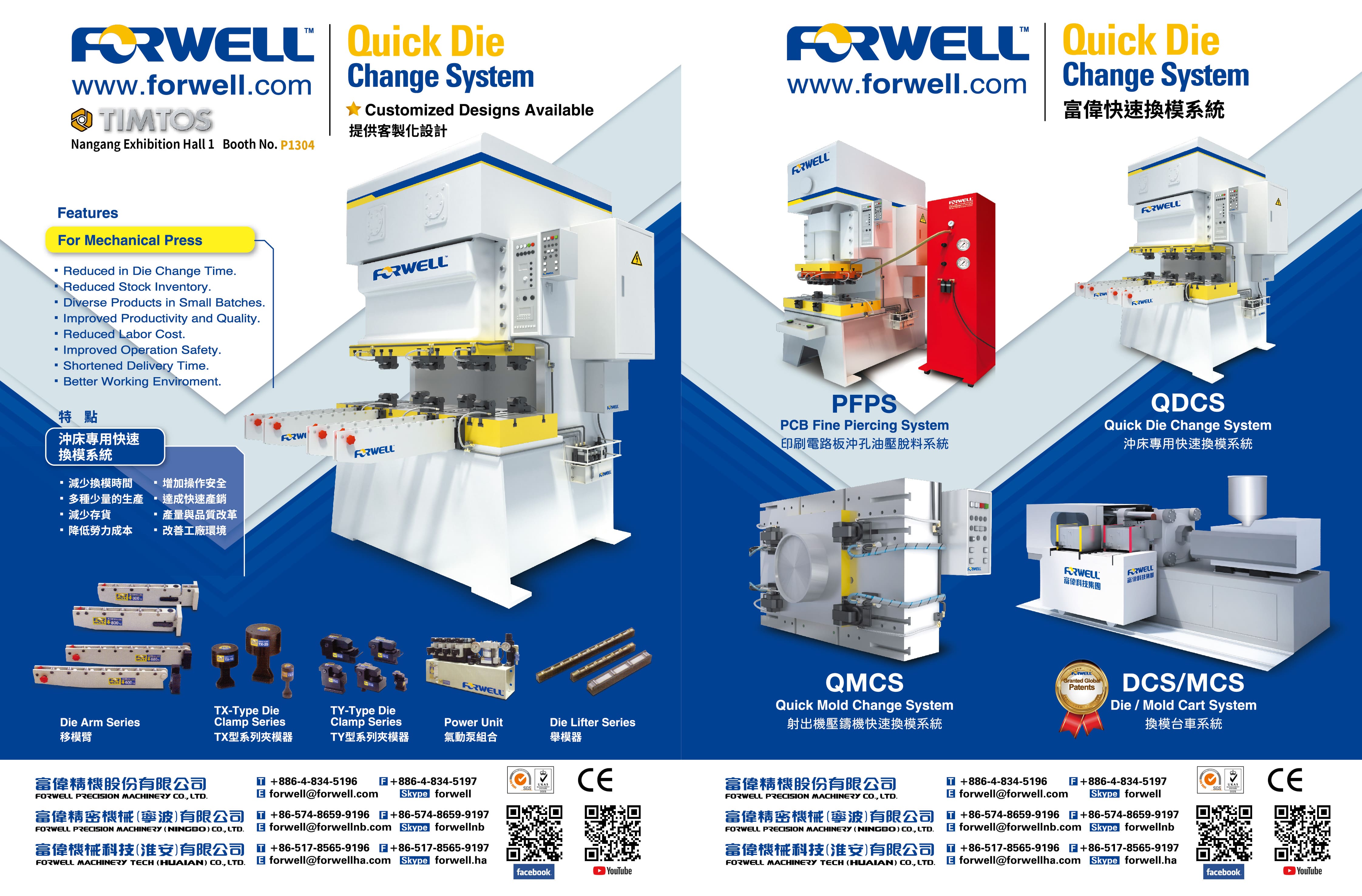 QUICK DIE CHANGE SYSTEM to be adopted along with various kinds of die/mold clamping systems for automatic machines such as punch presses, injection molding machines and die casting machines, PCB FINE PIERCING SYSTEM, and various series die clamp system. In the aspect of quality and function of our product, we have been acknowledged and manufactories. Under stable growth, FORWELL still adhere to our operation principle: [Quality and Service and Innovation ] under constant development and research, we present our quality product completely to meet the demand of our customers.