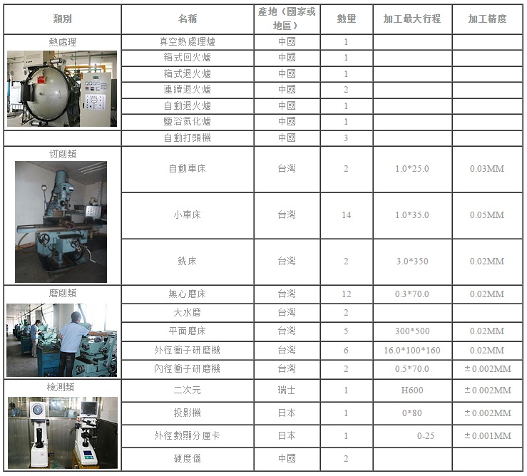 Presently, our production equipments are mainly imported from America, Switzerland, Japan and Taiwan. Our workshop is equipped with Japan brand SEIBU, SODICK, FANUC high precision wire-cut, EDM, CNC milling machine, CNC lathe ( turning ), Deep bore drilling machine, centerless grinder, external/internal grinding machine, pin lap grinding machine, vacuum heat treatment, salt-bath nitriding furnace , etc.