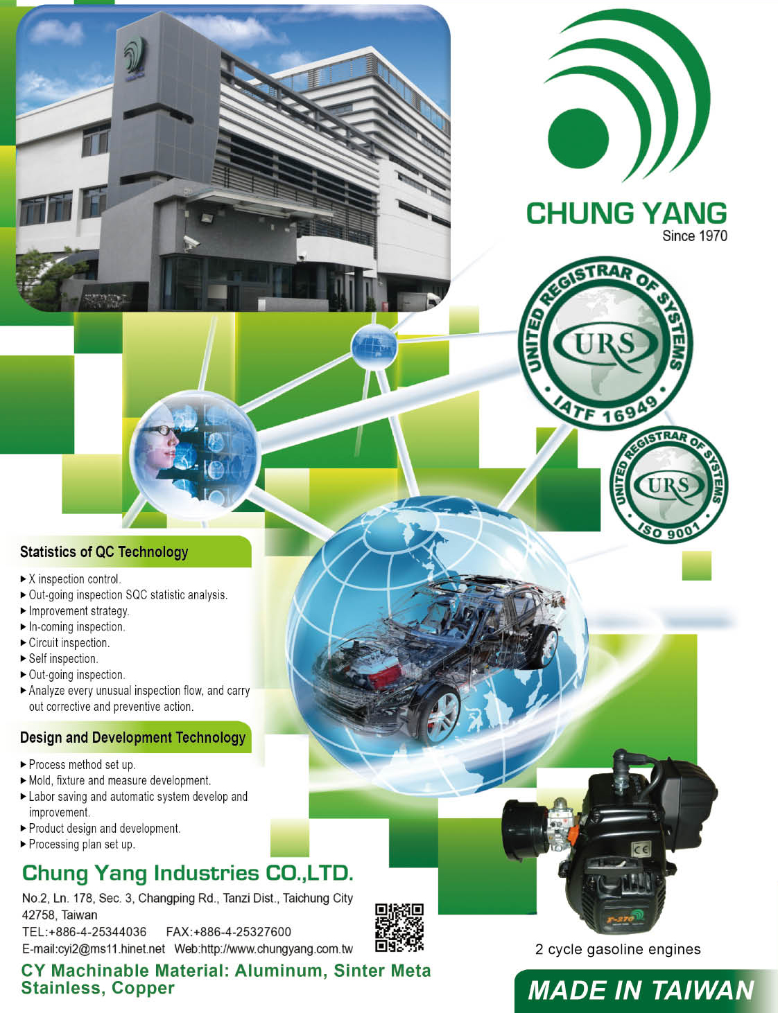 Chung Yang Industries has established in 1970,which has reached the 50th anniversary, In the early days, it started as a sewing machine parts processing, and has been manufacturing parts for the most famous sewing machine manufacturers in Japan for many years. Since 1975, it has produced remote control engines for model airplanes, automobiles, and ships. It is the main business of travel engine and professional OEM. In 2007, it successfully transformed into OEM auto parts manufacturing. It is the precision parts of Japanese original auto OEM parts. Since its establishment, it has been meeting customer expectations and producing high-quality products, manufacture high quality products and ensure on-time product delivery and is highly trusted by all customers.