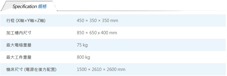 產品特性 : 針對LED、小間距連結器、IC模具等高精密電子零部件的大批量生產加工,實現了模具的高精度,可連續長時間穩定加工多模穴的放電加工機種。