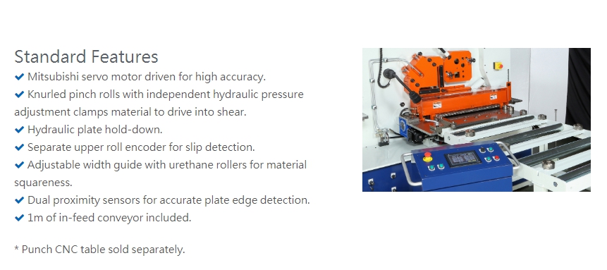 The automatic CNC plate shear feeding system is available as a factory-installed addition to SUNRISE dual-cylinder ironworkers with 100 tons or more capacity. The CNC plate shear system dramatically reduces manual shearing time and plate positioning. Omron touch-screen controller provide operator simple programming to input material length, cut lengths and number of pieces needed. The system automatically processes the plate to length. The feeding system featuring knurled drive rollers, hydraulic hold-down and proximity sensors to achieve the highest quality parts.