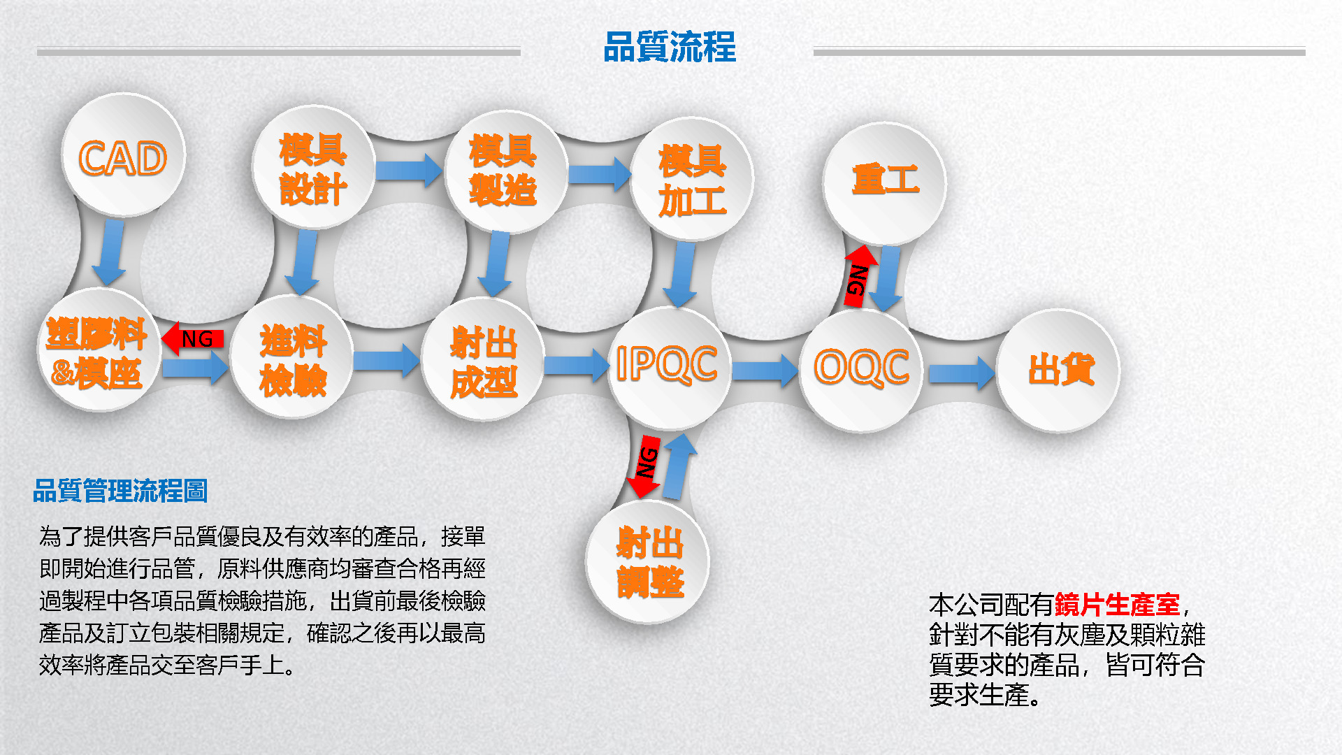 主要產品:電子產品,光學鏡片,汽車引擎零件,汽車燈殼,連接器,相機零件,醫療器具。