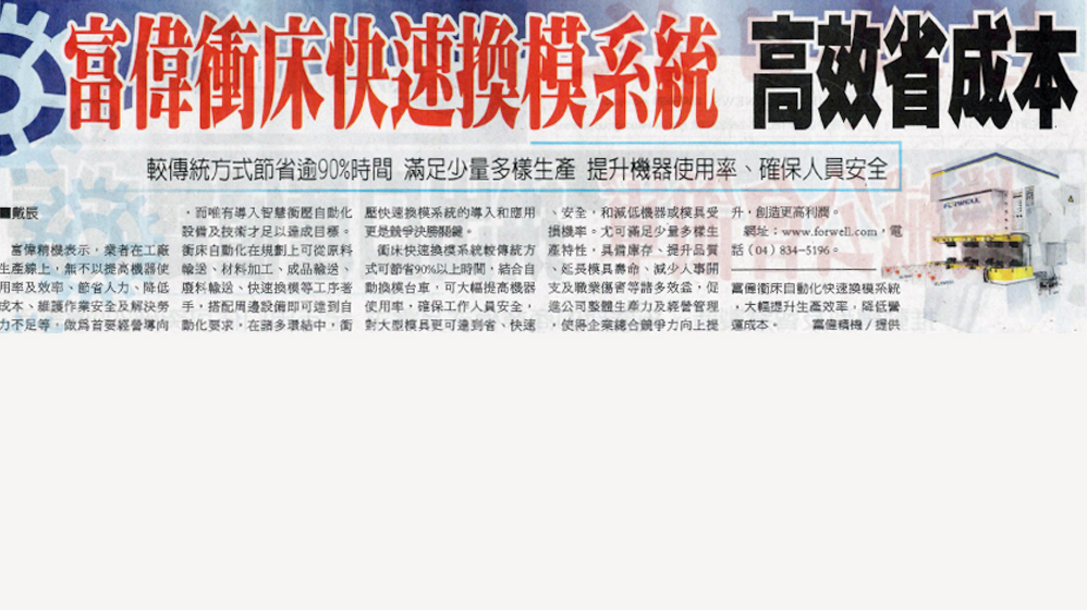 1997年10月富偉公司是台灣第一家榮獲ISO-9002認證生產快速換模工廠,隔年更獲得CE認證,我們不只是將產品賣給客戶,而是將國際認證的品質一同交付給客戶。