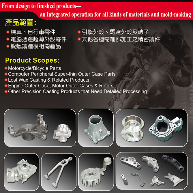 我們的壓鑄零件產品完全符合每一位客戶的需求,包括汽、機車精密零件、腳踏車專用打氣筒幫浦零組件、投射燈具零組件、瓦斯點火系統零組件、3C家電產品零組件等等;除了集中於生產鋁合金和鋅合金壓鑄件品,我們也提供設計和OEM服務。隨著主客觀環境條件的轉變,介穩致力於加速硬體部分的投資與改善,更要求管理軟體的全部提升,品質的提高,產品的創新,一切堅持合理化、制度化、現代化的原則更引進 SWISS TEST 三次元等同步測量的儀器,提高模型測量能力,進而提供客戶更精準更穩定的品質。