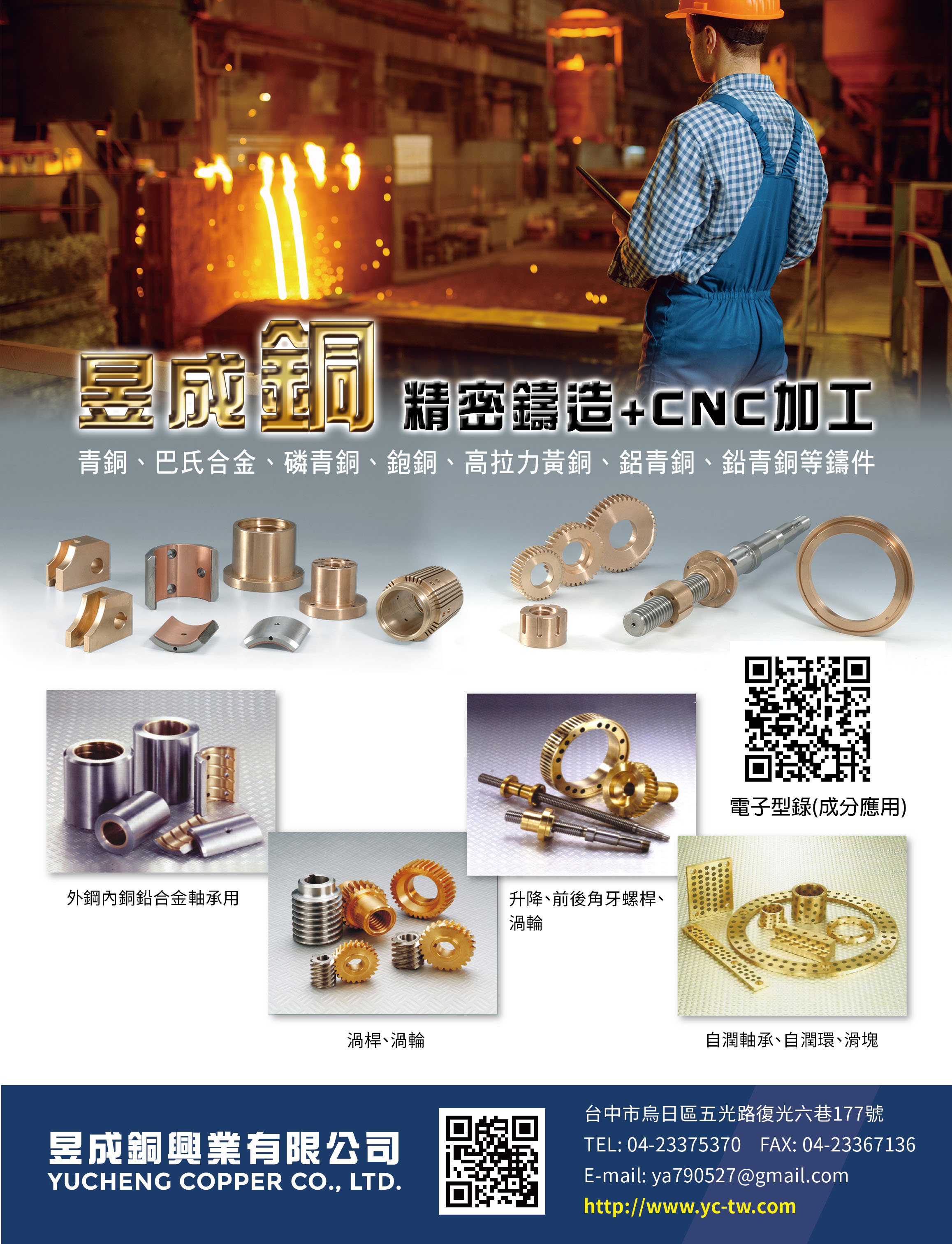 昱成銅興業有限公司主要產品有外鋼內巴氏合金軸承,外銅內巴氏合金軸承,外鋼銅鉛合金軸承,蝸桿、蝸輪、升降、前後角牙螺桿蝸輪、油壓缸套筒、離心銅管、自潤軸承、自潤環、滑塊等,材料包括青銅、磷青銅、鉋銅、鋁青銅、鉛青銅等。