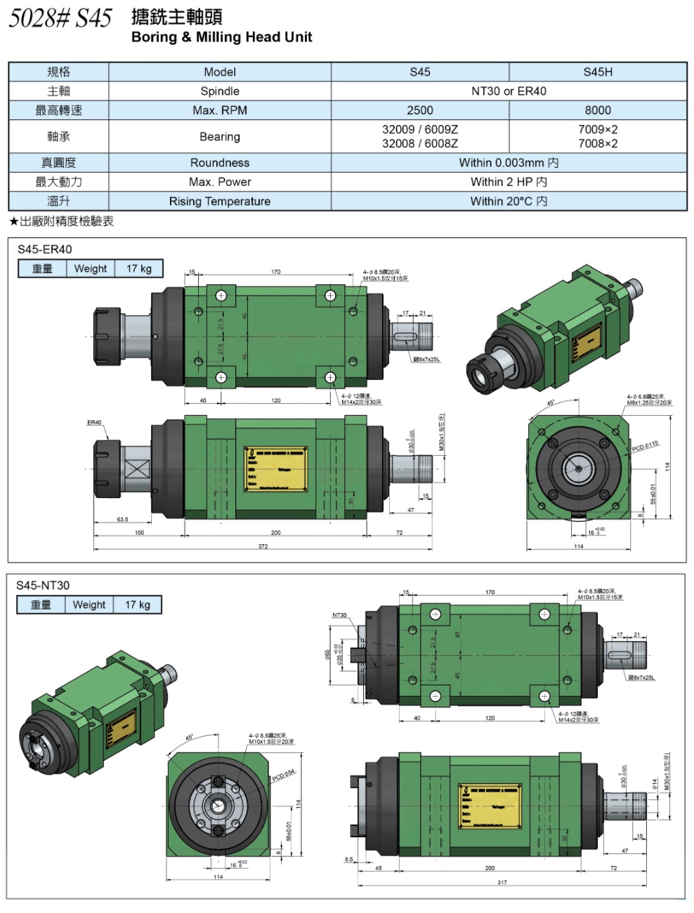 S45主軸使用德國SKF或日本NSK軸承,精度保持0.003mm內,搪銑主軸頭最高轉速8000,適合搭配伺服滑台或油壓滑台,提升加工效率!