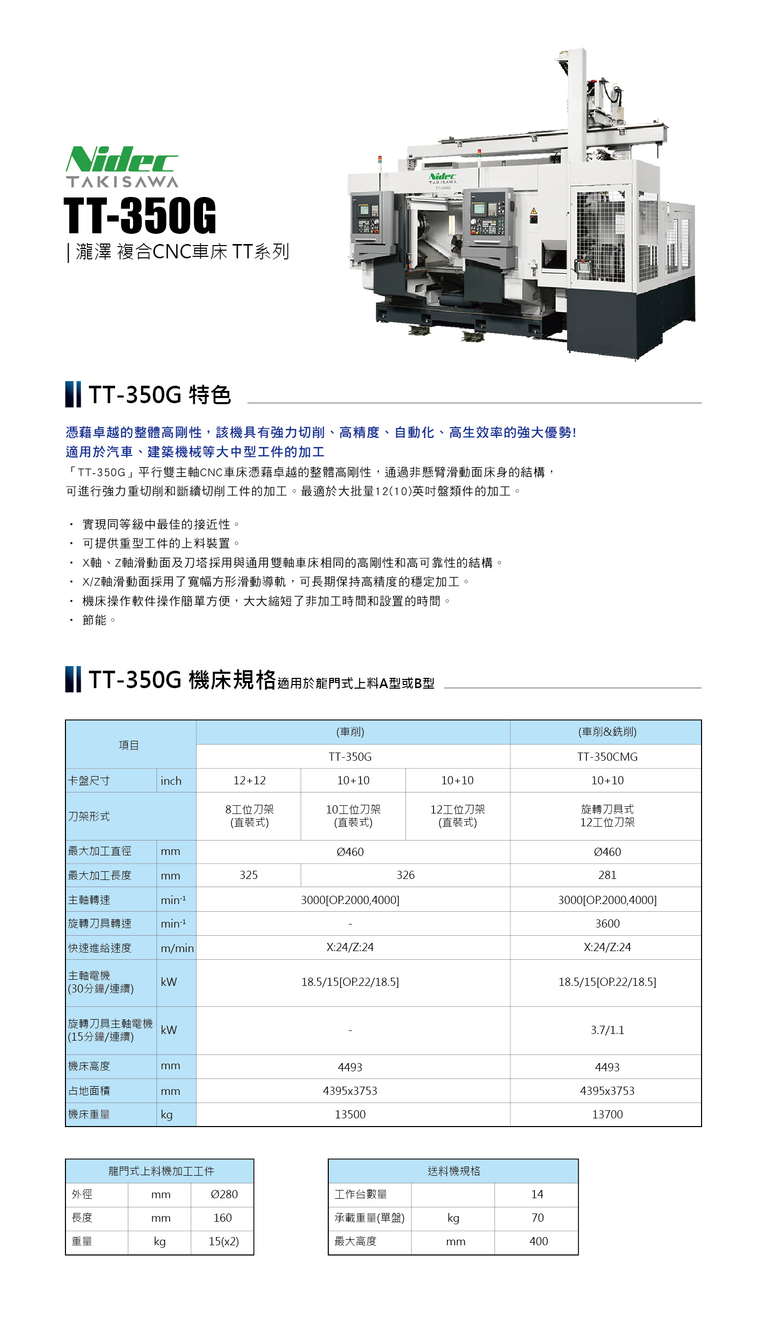 「TT-350G」平行雙主軸CNC車床憑藉卓越的整體高剛性,通過非懸臂滑動面床身的結構,可進行強力重切削和斷續切削工件的加工。最適於大批量12(10)英吋盤類件的加工。