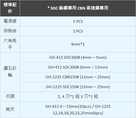 研磨 2、3 及 4 刃端銑刀,精密、效率、易操作,縮短製程時間,研磨直徑 (GH413-4~13mm、GH1225-12~25mm) 1. 高效率、高品質研磨滑程(滑率),有良好的研磨效果 2. 品質保證 0.02mm 3. 容易操作,供緊急的方便用具,快速