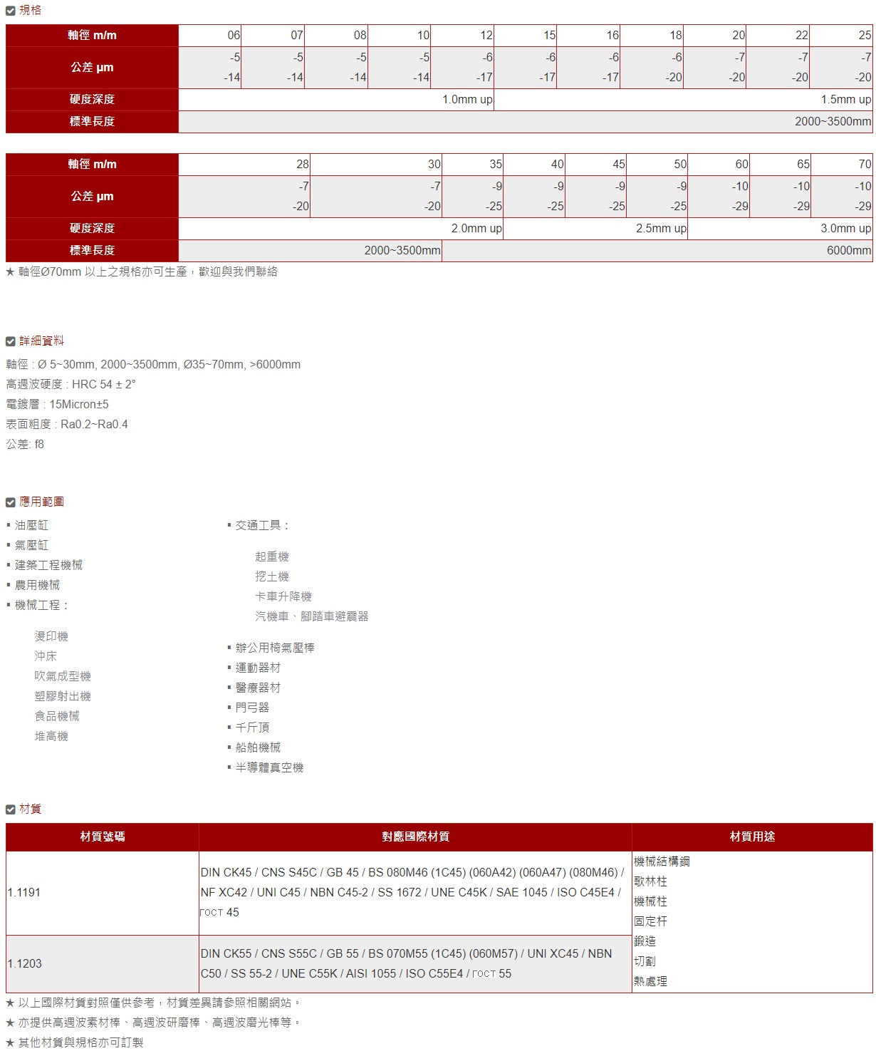 高週波鍍鉻軸心的材質為JIS S45C / DIN CK45 / AISI 1045和JIS S55C,經高週波熱處理後,硬度比普通電鍍鋼棒高,表面分佈均勻且無軟點。此硬軸適用於機械導桿、哥林柱、線性滑軌、重力工程用吊桿、運動設備、推高機、平台升降機、彎管機、製罐機、合板機械、裁板機、板材成型機、火力發電油釭、鏟土機等農用機械。