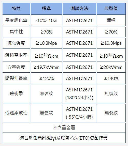 以醫療等級聚烯烴製作的2.5:1收縮比醫療級熱縮套管, 具滿足手術使用之侵入性器械所要求薄壁及平滑的特性需求, 良好的電氣絕緣性, 可用於電外科器械的絕緣保護使用, 是廣泛應用於醫療器械上的熱縮套管。