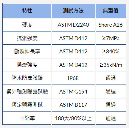 應用: 使用高耐候性Silicone橡膠擴張於支撐管上, 在電纜線接頭需要絕緣密封保護處將支撑管拉開, Silicone橡膠管即收縮緊密包覆於接頭處, 能在不允許火源及狹窄環境下無須使用工具快速的施工, 應用於通訊基站電纜接頭處的密封保護。 操作溫度範圍: ・連續使用溫度: -400˚C〜90˚C ・建議儲存期限: 1年 顏色: 標準顏色: 灰色